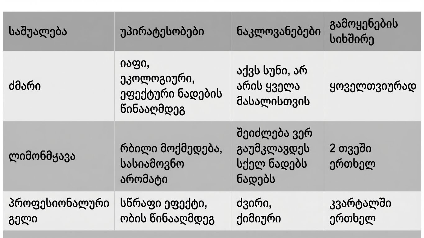 - ძმარი — კირქვის დასაშლელად და სუნის შესამცირებლად